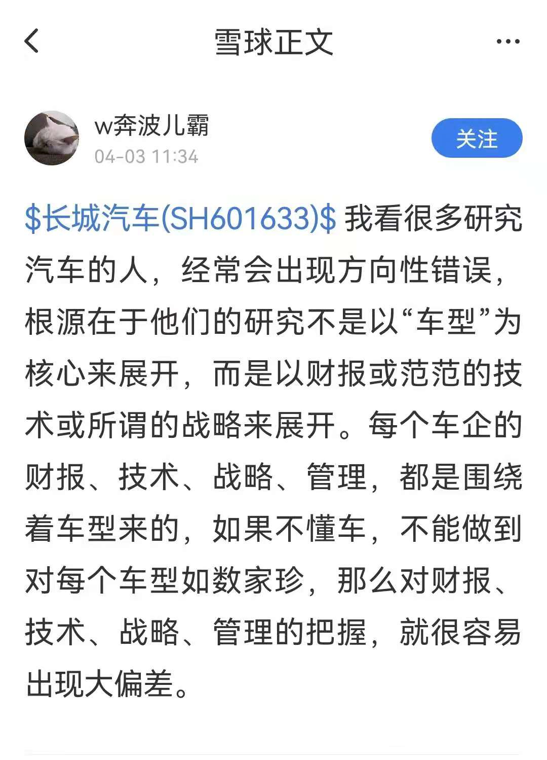 从2019年就开始看好长城汽车的球友@w奔波儿霸表示:很多研究汽车的人,经常会出现方向性错误,根源在于他们的研究不是以“车型”为核心来展开,而是以财报或范范的技术或所谓的战略来展开。每个车企的财报、技术、战略、管理,都是围绕着车型来的,如果不懂车,不能做到对每个车型如数家珍,那么对财报、技术、战略、管理的把握,就很容易出现大偏差。