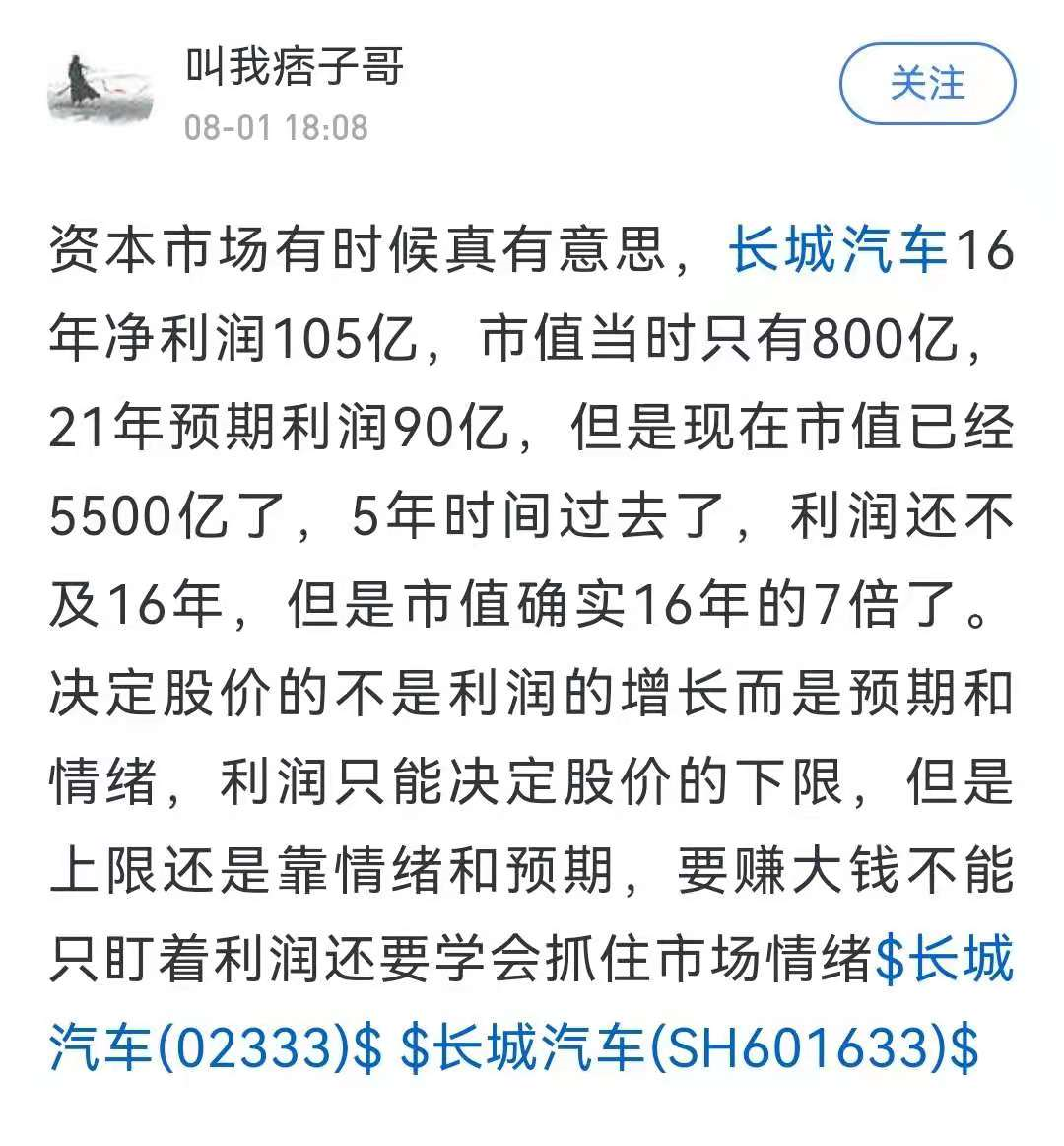 球友@叫我痞子哥:资本市场有时候真有意思,长城汽车16年净利润105亿,市值当时只有800亿,21年预期利润90亿,但是现在市值已经5500亿了,5年时间过去了,利润还不及16年,但是市值确实16年的7倍了。决定股价的不是利润的增长而是预期和情绪,利润只能决定股价的下限,但是上限还是靠情绪和预期,要赚大钱不能只盯着利润还要学会抓住市场情绪。