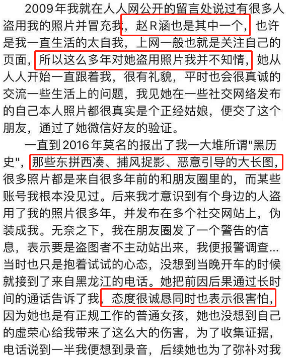 夏露第一时间寻求法律帮助,后知后觉发现是赵R涵一直在盗用自己的图片,伪装成自己在网上进行社交,才有了所谓的黑历史。