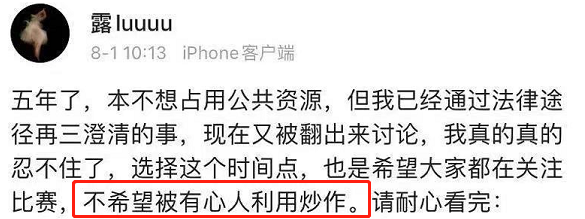 8月1日,马龙妻子夏露在社交平台发长文,再次解释五年前被广为流传的虚假黑料。她表示现在澄清也是觉得大家都在关心奥运,不会被有心人炒作利用。