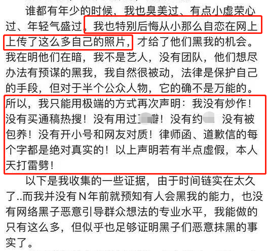 这次,她勇敢发声,辟谣自己没有炒作、没有买通稿、没有是私生活混乱,也没有开小号怼网友。她表示,自己律师函、道歉信每一个字都是真实的,如有虚假愿天打雷劈。