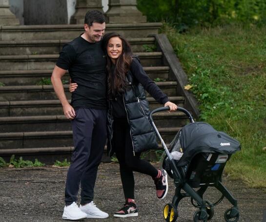 前英格兰球星亚当-约翰逊与女友斯塔茜外出散步,推着他们刚出生的儿子阿尔利。