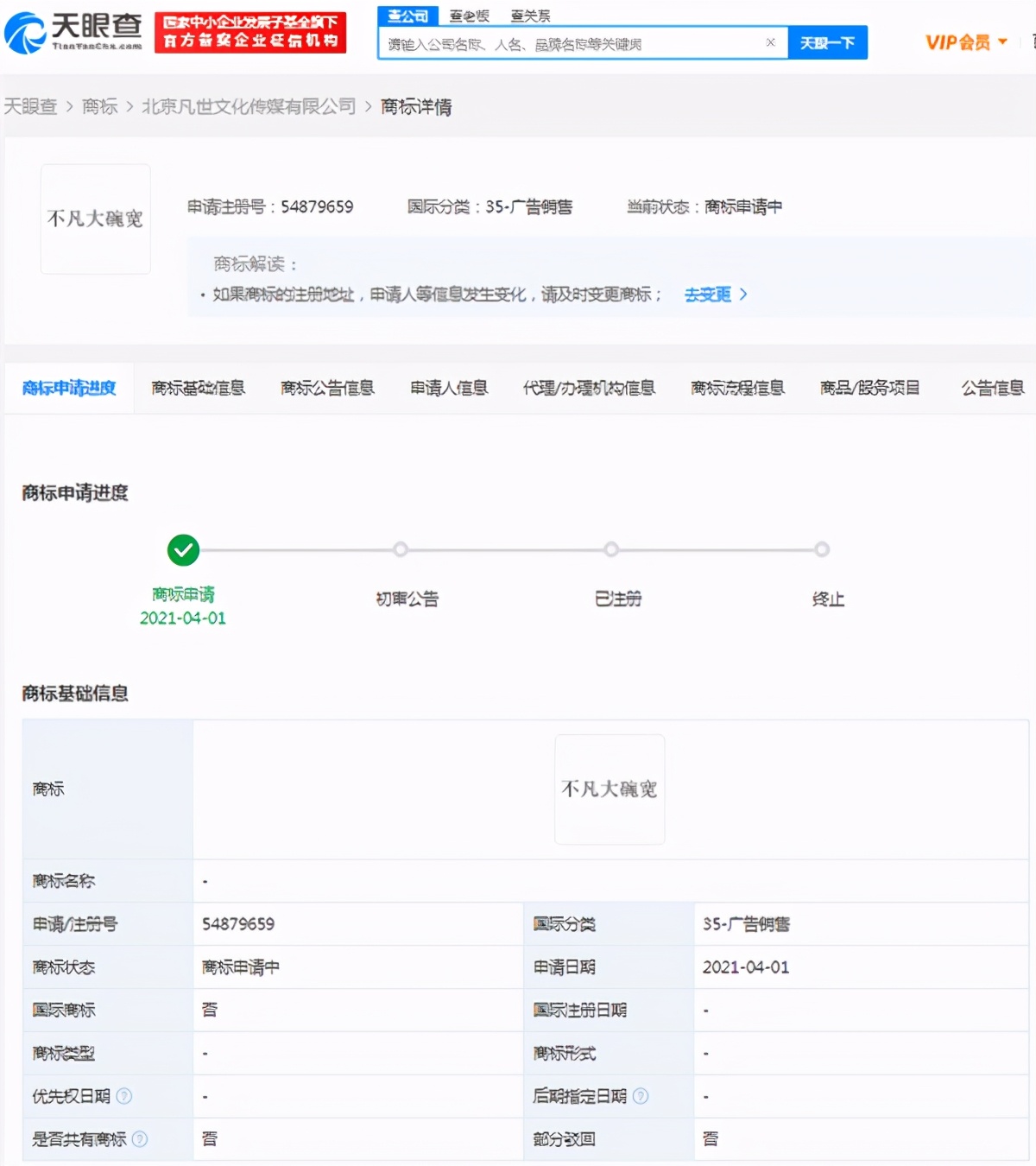 据天眼查APP显示,近日,北京凡世文化传媒有限公司(吴亦凡工作室关联公司)申请注册“吴记大碗宽”“不凡大碗宽”商标,国际分类包括广告销售、食品、医药等,当前商标状态为“商标申请中”。