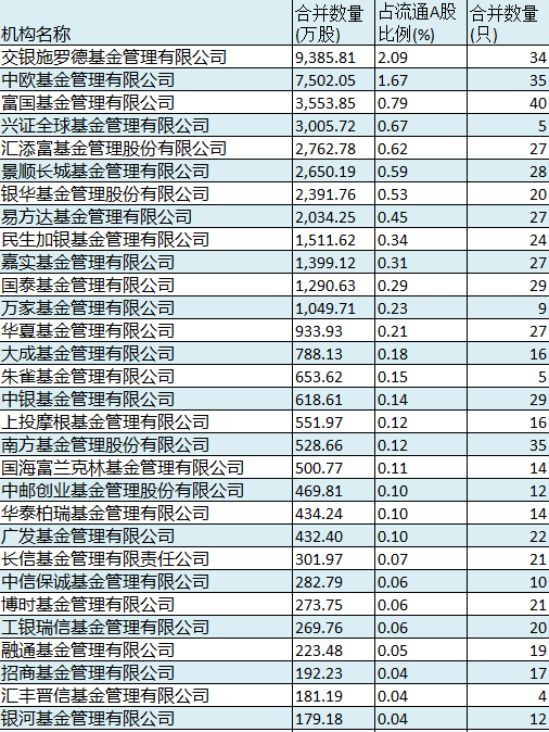 wind数据显示,交银施罗德基金旗下34只产品合计持有9385万股。中欧基金旗下35只产品合计持有7502万股。富国基金(博客,微博)旗下40只产品合计持有3553万股。兴全5只产品合计持有3005万股。汇添富27只产品持有2700万股。