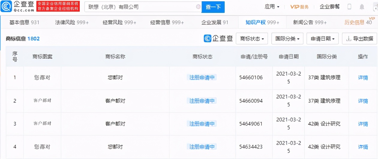 【TechWeb】4月8日消息,企查查APP显示,近日,联想(北京)有限公司新增“您都对”、“客户都对”商标申请信息,国际分类涉及网站服务、建筑修理等,当前商标状态为“注册申请中”。