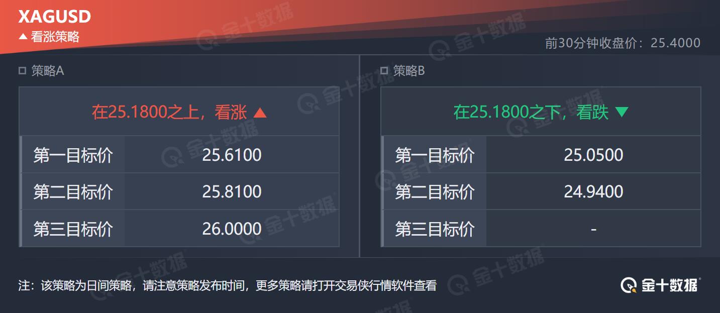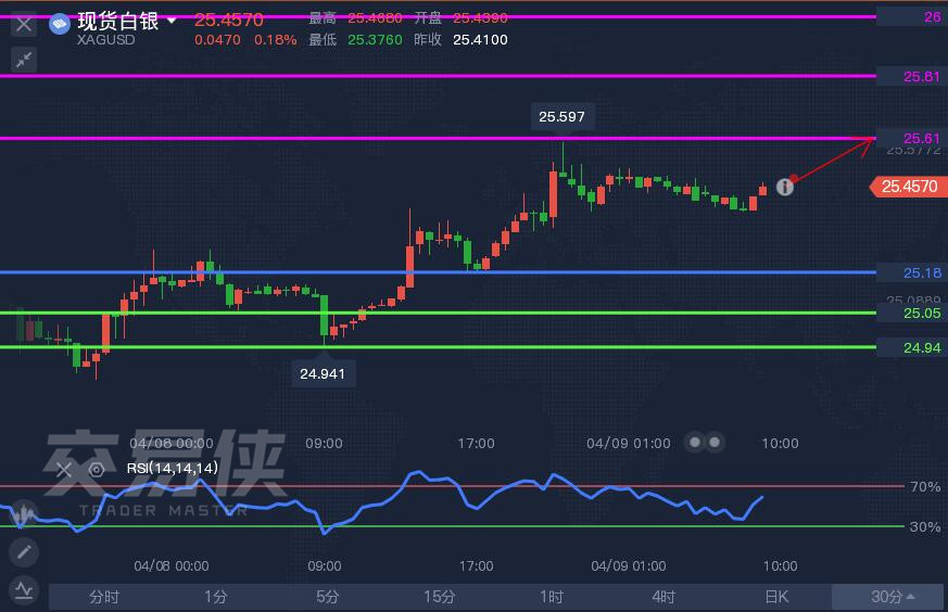 现货白银目前在转折点25.18上方看涨,留意25.61和25.81阻力位;若白银回落至转折点下方,则看空,支撑位为25.05和24.94。