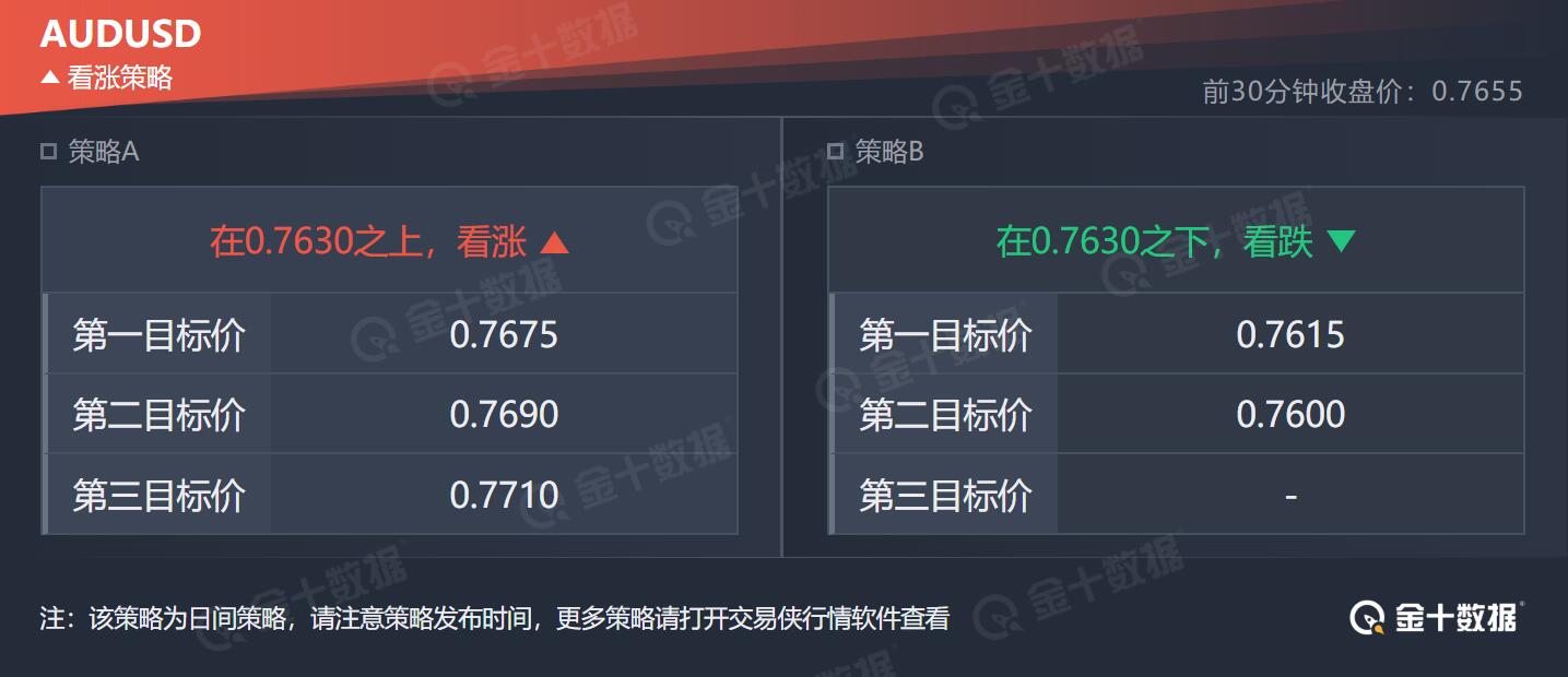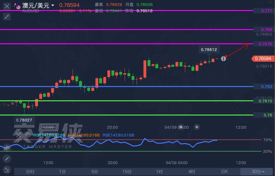 澳元兑美元目前在0.7630上方看涨,阻力位为0.7675和0.7690;若澳元兑美元回落至0.7630下方,则看空,支撑位为0.7615和0.7600。