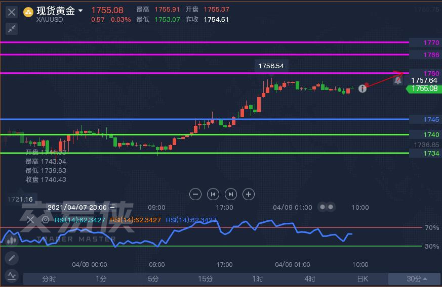 现货黄金周四站上1750美元关口,美元指数继续走软,险些失守92关口,10年期美债收益率也在跌。周五早盘,现货黄金处于横盘状态,在1754附近徘徊。今晚20:30,美国将公布3月份的PPI,预期录得0.5%,投资者需留意该数据是否会有更加靓丽的表现。
