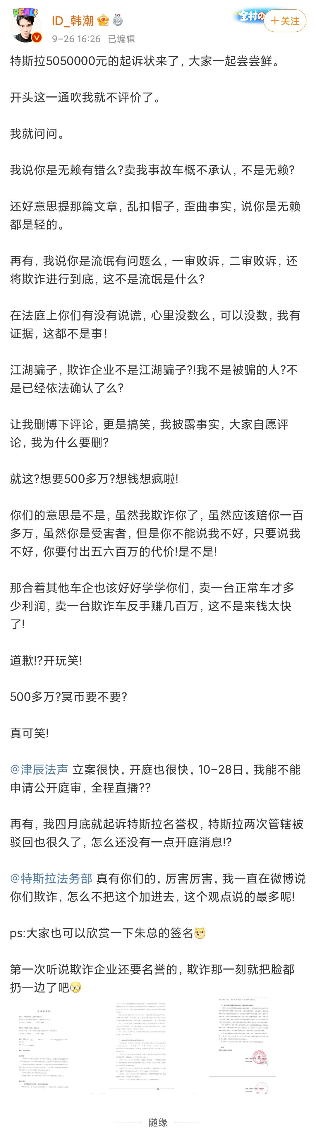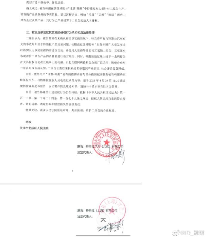 韩潮发布的起诉书显示,特斯拉要求其立即删除微博上所有侵权内容及回复,并索赔505万元。