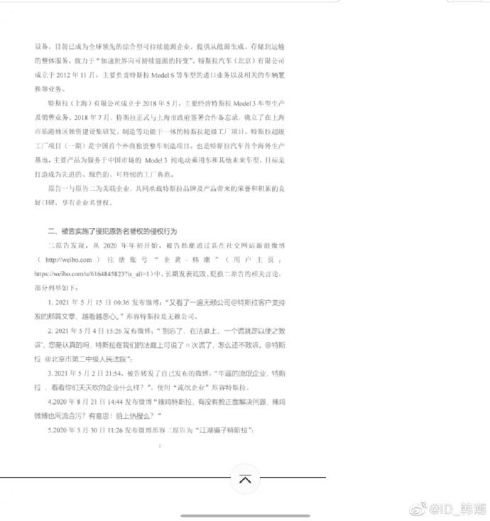 昨日下午,特斯拉“退一赔三案”车主韩潮在微博发文称,自己被特斯拉以侵犯名誉权为由起诉。