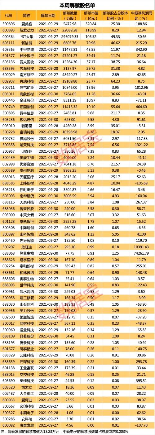 本周解禁股中,*ST大集、山石网科、通业科技、金证股份、上纬新材、海泰发展、爱旭股份的上半年业绩下滑明显。
