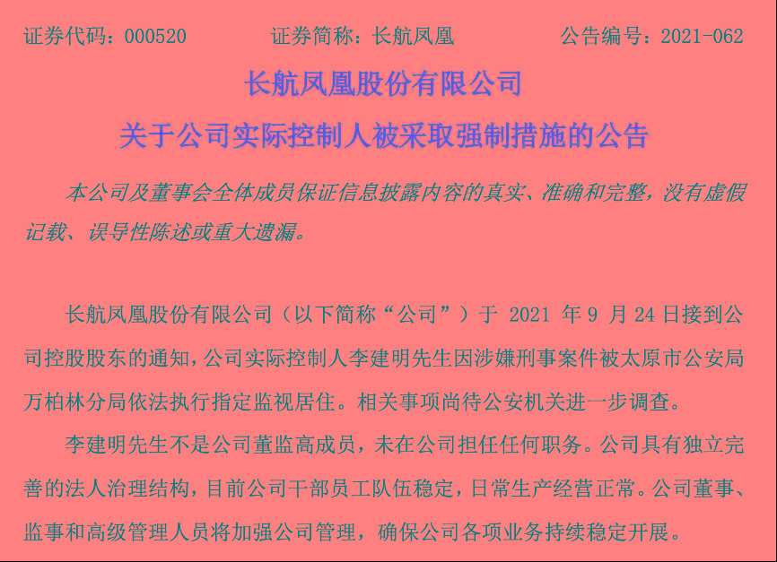 有“不死鸟”之称的长航凤凰于9月25日发布公告称,公司接到公司控股股东通知,公司实际控制人李建明因涉嫌刑事案件被太原市公安局万柏林分局依法执行指定监视居住。相关事项尚待公安机关进一步调查。长航凤凰表示,李建明不是公司董监高成员,未在公司担任任何职务。