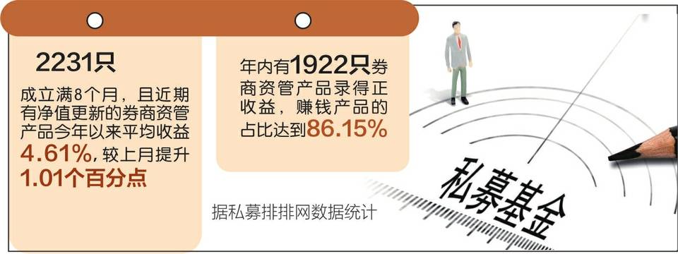 受市场行情回暖影响,券商资管产品今年来的收益也快速回升。据私募排排网数据统计,2231只成立满8个月,且近期有净值更新的券商资管产品今年来平均收益为4.61%,较上月提升1.01个百分点。年内有1922只券商资管产品录得正收益,赚钱产品的占比达到86.15%。