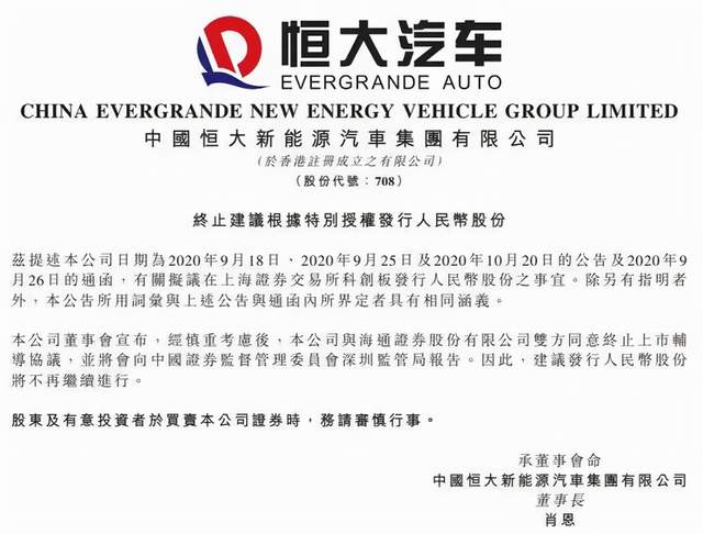 9月26日晚间,恒大汽车(0708.HK)发布公告称,经慎重考虑后,公司与海通证券股份有限公司双方同意终止上市辅导协议,并将会向中国证券监督管理委员会深圳监管局报告。因此,建议发行人民币股份将不再继续进行。