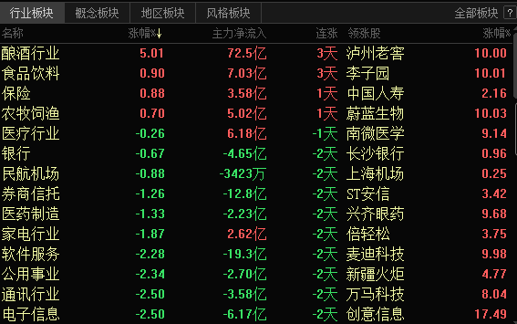 财联社9月27日电,大小指数延续分化,临近午盘跳水,中证1000指数跌3.75%,下跌个股超3800家,两市半日成交额超9500亿。白酒股全线走强,古井贡酒、泸州老窖等股涨停,贵州茅台一度封板,半日成交额达186亿元;化工、稀土等周期板块和前期强势的电力股大跌,个股跌停潮。从盘面上,养鸡、白酒、超级品牌、猪肉等板块涨幅前列,钴、氟化工、小金属、稀土等板块跌幅居前。截止午间收盘,沪指跌1.3%,深成指跌0.55%,创业板指涨0.43%。沪股通早盘净流入8.85亿,深股通早盘净流入14.47亿。