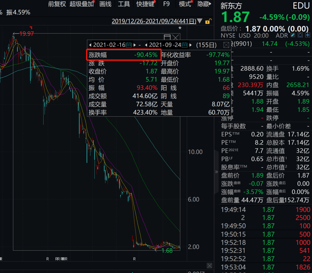 众所周知,随着“双减”落地后,教育培训行业也经历了一次强烈的地震。不少头部教培机构的股价已经跌到只剩下零头。新东方也不例外。wind数据i希纳是,与近一年最高点相比,新东方的股价已经从19.97美元的高点跌至最新的1.87美元每股,股价跌去超90%,市值仅剩下32亿美元,蒸发了近2000亿元人民币。