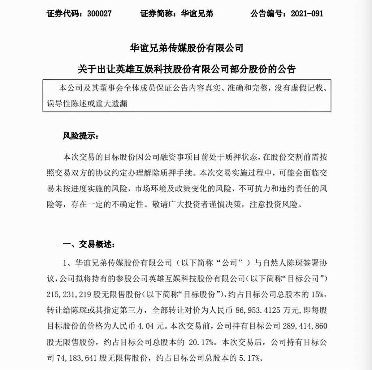 9月24日,华谊兄弟(300027)公告,公司与自然人陈琛签署协议,公司拟将持有的参股公司英雄互娱(430127.NQ)215,231,219 股无限售股份,约占英雄互娱总股本的 15%,转让给陈琛或其指定第三方,全部转让对价为人民币8.695亿元,即每股目标股份的价格为人民币4.04 元。