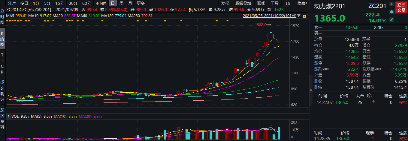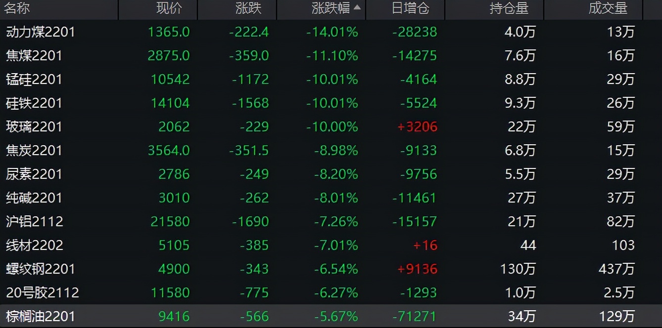 今日期货市场暴跌行情再度上演,截至收盘,动力煤、焦煤主力合约跌逾10%。锰硅、硅铁、纯碱等多个主力合约品种跌停。