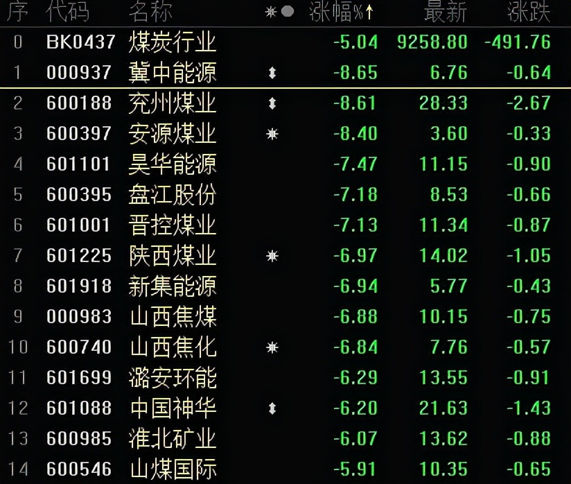 期货市场大幅杀跌的同时,A股市场周期板块表现也较为颓靡。今日煤炭板块大幅杀跌,板块指数跌幅居两市之首,冀中能源、兖州煤业、安源煤业跌超8%。主营纯碱的山东海化、远兴能源跌超9%。