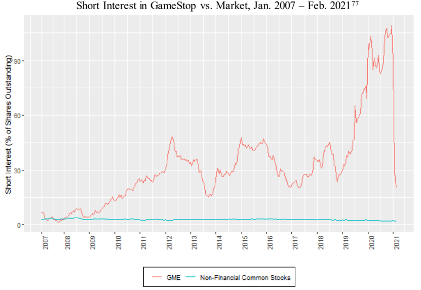 值得一提的是,该报告指出,游戏驿站在当时有着惊人的卖空比例(被卖空的股票数量与流通股的比率)。甚至在2020年12月31日,游戏驿站的卖空比就超过了100%,达到109.26%。SEC报告称,如果有人从卖空者手里买到了股票,并且有将股票借出,看上去该股票被卖空了两次,也就导致卖空比超过了100%。在2021年1月份,游戏驿站是唯一一只卖空数量超过其流通股的股票。