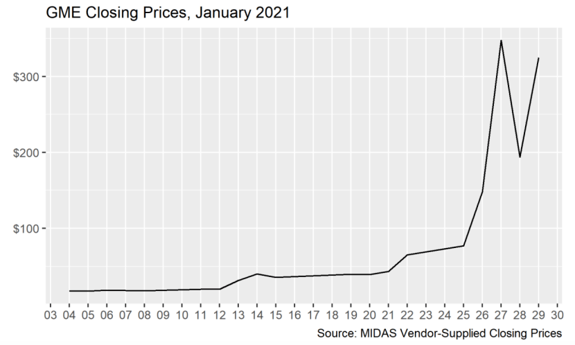 游戏驿站(GME)2021年1月收盘价走势图(来源:SEC报告)