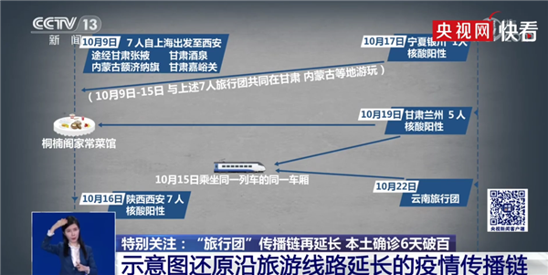 上述兰州旅行团中首例确诊的成员的密切接触者中,还涉及到一个来自云南的旅行团。流调信息显示,云南昆明一旅行团20人乘坐旅游大巴自宕昌来兰州,团中6人系确诊病例张某10月15日乘坐的D2746次列车6车厢同乘人员。其中4人检测结果为阳性。同辆列车上,目前至少有13名乘客感染。