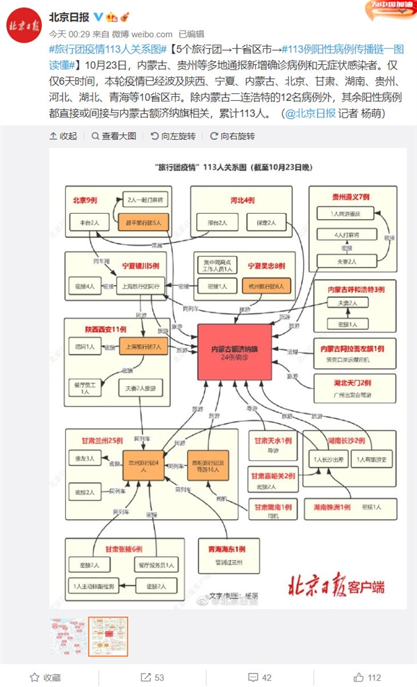 除内蒙古二连浩特的12名病例外,其余阳性病例都直接或间接与内蒙古额济纳旗相关,累计113人。