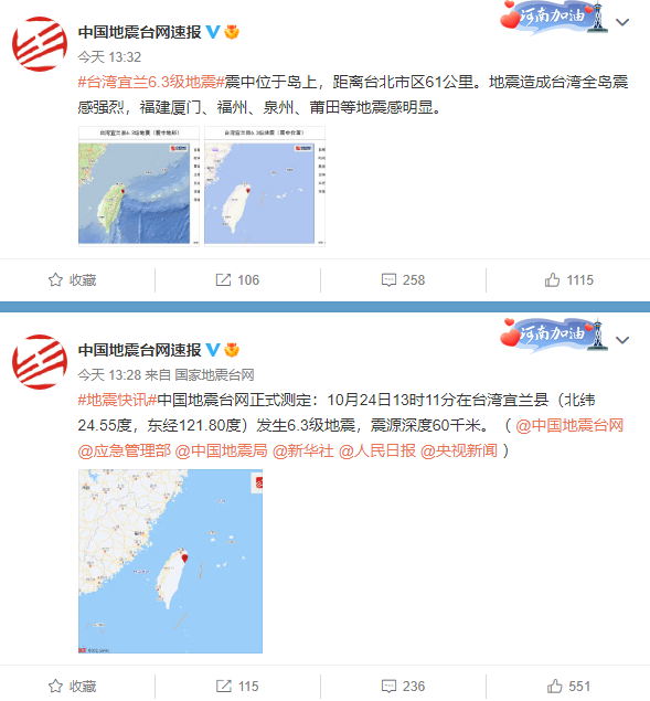 据中国地震台网速报官微,中国地震台网正式测定:10月24日13时11分在台湾宜兰县(北纬24.55度,东经121.80度)发生6.3级地震,震源深度60千米。