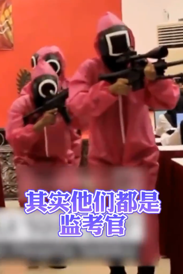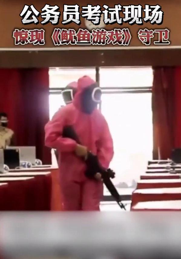 据报道,10月20日,印尼东爪哇超百名考生正在进行公务员选拔考试,5名装扮称韩剧《鱿鱼游戏》守卫的人突然闯入,手持“枪械”瞄准考生。