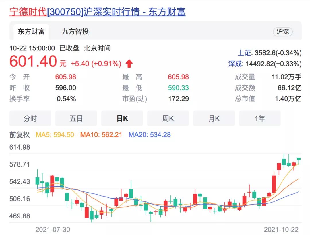 上周,宁德时代继续高开高走,截至周五收盘,股价历史首次收在600元以上,市值突破1.4万亿元,成为仅次于贵州茅台的第二大市值股。