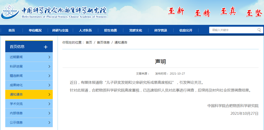 据中科院合肥研究院官网消息,针对有媒体报道称“儿子获奖发明和父亲研究所成果高度相似“一事,中国科学院合肥物质科学研究院27日发布声明。声明称,针对此报道,合肥物质科学研究院高度重视,已迅速组织人员对此事进行调查,后续将及时向社会反馈调查结果。