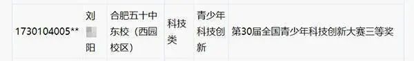 2017年合肥一六八中学科技类特长生报名名单中刘某阳的信息