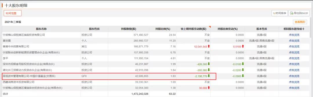 从爱尔眼科的股东名单来看。今年三季度,高瓴资本亦从爱尔眼科前十大流通股东名单消失,意味着高瓴资本原有的8200多万股至少卖出了6000万股。另一只股票是泰格医药,高瓴已经退出前十大流通股东名单,但无法判断是否为减持。因为二季度末,高瓴的持股量为750万股。而该公司三季度第九大流通股东持股近800万股,高瓴也可能是被挤出前十大股东。
