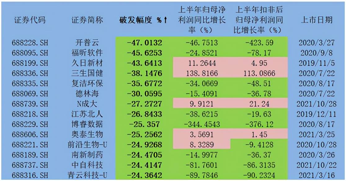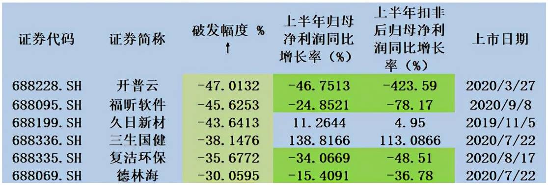 由于部分个股的三季报尚未披露,记者以半年报数据比对来看,上述股价破发较大的科创板企业的业绩都有明显的下滑。