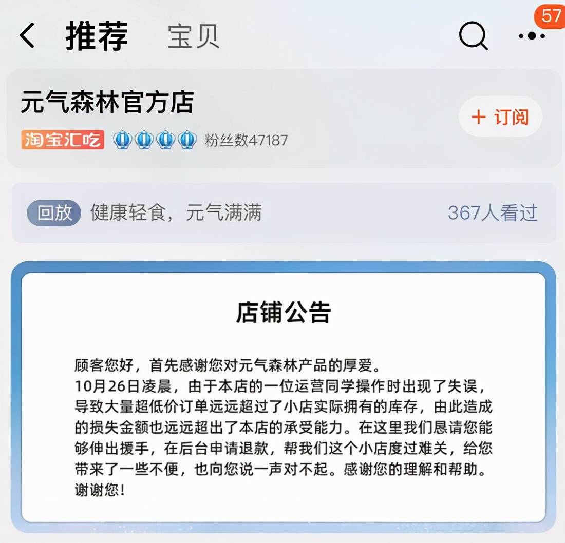 10月27日,淘宝元气森林官方店发布公告称,10月26日凌晨,因本店运营工作人员操作失误,导致大量超低价订单远远超过商店实际拥有的库存,由此造成的损失金额也超出该店的承受能力。