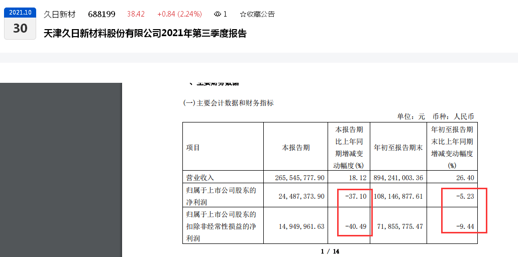 刚刚,久日新材披露的2021年第三季度报告显示,尽管今年第三季度、前三季度营收同比均增长,但归母净利润同比均下滑。