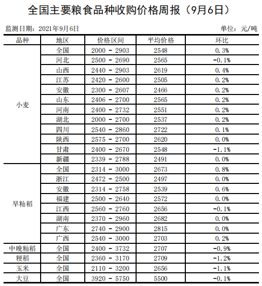 原标题:全国主要粮食品种收购价格周报(9月6日)