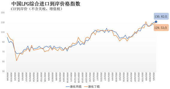 9月15日,海关总署全球贸易监测分析中心和上海石油天然气交易中心发布的中国液化石油气(LPG)综合进口到岸价格指数显示,2021年9月6日-12日,中国液化丙烷综合进口到岸价格指数为130.82点,环比上涨0.79%,同比上涨66.73%;中国液化丁烷综合进口到岸价格指数为129.53点,环比上涨2.83%,同比上涨79.35%。