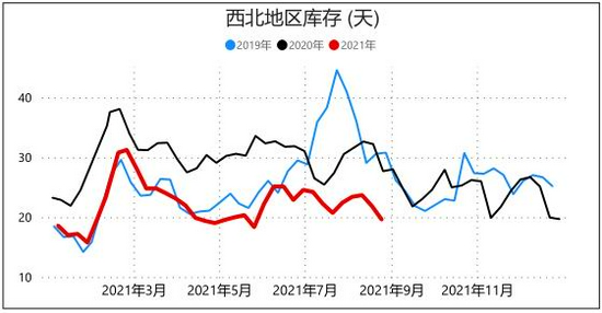 江苏、浙江和华南地区甲醇库存在93.3万吨,月度累库12万吨左右,增幅在14%,整体沿海地区甲醇可流通货源预估在22.1万吨附近。甲醇西北地区厂库在19.61天。
