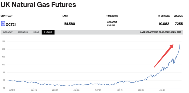 欧洲天然气期货价格周三突破每千立方米880美元,创历史新高。ICE英国天然气期货则一度突破194.94便士/千卡,同创历史新高。此前位于英国东南部肯特郡IFA发电站因火灾而关闭,该电站为英国电力能源系统的重要设施,法国通过该电站向英国输送电力。