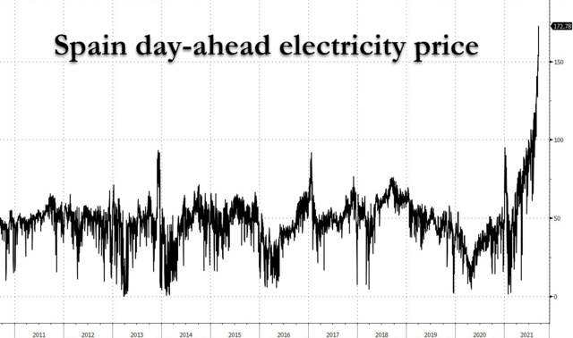 在西班牙,该国电力价格周二跃升至每兆瓦时172.78美元,创历史新高,自夏季开始价格飙涨200%以上。