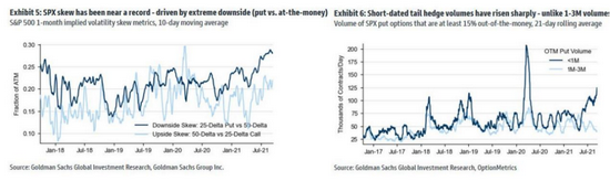这2万亿的交易量中包含了9750亿的SPX期权,其中有3300亿在同一日到期,1200亿在下一交易日(即9月13日周一)到期。高盛注意到,在标普500连续5日的下跌中,这些巨额、深度看跌的期权,反映出投资者并不会在日常交易中提前做好计划并持续对冲,而是在市场发生下跌后才会想起对冲。