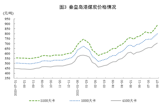 港口煤炭综合交易价格上涨。8月27日,秦皇岛港5500大卡、5000大卡、4500大卡动力煤综合交易价格分别为每吨885元、798元和706元,比7月30日分别上涨40元、25元和20元。