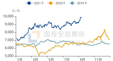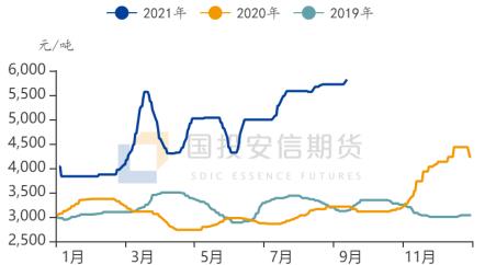 电石原料是煤炭,受到双控政策影响巨大。电石价格不断被推高,推高PVC成本的同时,导致利润下滑,开工受到影响,成本抬高和供应的减少进一步推升价格,进一步带来下游企业利润的挤压。目前外采电石法PVC企业盈利能力很差。今年以来电石价格始终维持高位运行,从图中可以看出,今年电石价格明显高于往年。以山东地区电石(295L/KG以上)价格来计算,截止到9月14日,今年以来平均价格为4809.49元/吨,同比去年同期上涨1773.32元/吨,涨幅36.87%。