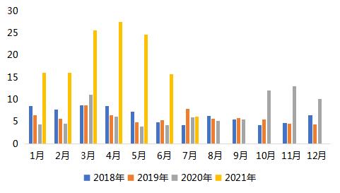 据了解,通常PVC铺地制品对PVC粉的单耗在0.3-0.4吨,由于PVC铺地制品多数产品用于出口外销,因此从PVC铺地制品出口量分析,2021年1-6月PVC铺地制品企业对PVC粉的消耗量在79.536万吨-106.048万吨区间内,同比2020年增加16.713万吨。因此,PVC铺地制品在2021年对PVC粉消耗量的增长也是导致PVC粉社会库存长期低位徘徊的因素之一。