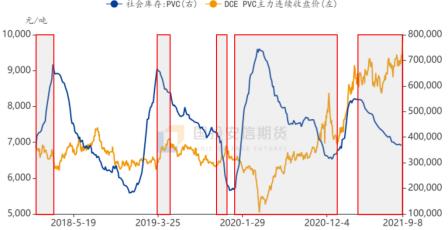 通过我们对于PVC社会库存和PVC价格波动的规律的统计学分析来看,每年3月中下旬会出现社会库存出现年内高点,之后进入去库存周期。从图中可以明显看出,2021年的库存高点明显低于往年同期水平,需求对于价格的支撑水平较强。并且,我们发现,2020年以前库存和价格波动没有明显的相关关系,但是2020年以后库存水平和价格呈现了较强的负相关关系,价格波动方向和库存水平大多时间内呈现反向波动规律,说明需求对于价格的驱动成为主要影响因素之一。