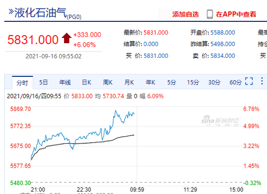 9月16日早盘,液化石油气(LPG)主力合约涨幅扩大至6%以上,截至上午9:55分,报5831元/吨。LPG标的大幅上涨也带动相关认购期权普涨。