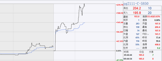 其中PG2111-C-5850期权合约日内上涨达220%以上,其余行权价为5900、5950、6000的2111看涨期权合约盘中涨幅均超过200%。