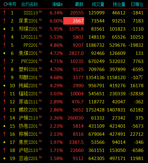 9月16日,早盘期市大面积飘红,能化品整体走高,动力煤期货再创新高,铁矿续创去年五月以来新低。不锈钢涨超6%一度涨停,动力煤涨近6%,尿素封涨停,收涨6%,液化石油气涨超5%,焦煤、聚丙烯、甲醇、塑料、聚氯乙烯、纯碱涨超4%;跌幅方面,铁矿跌超4%,花生期货主力合约跌超2%。