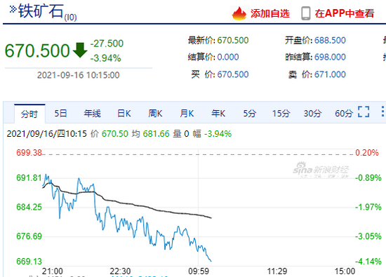 9月16日早盘,铁矿石主力合约走低,日内跌近4%,现报670.5元/吨。